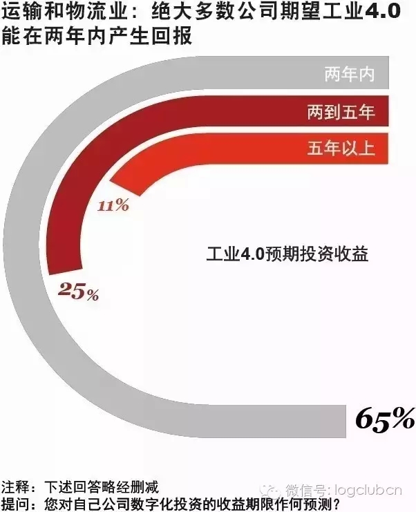 企业在构建强大的数据分析能力过程中面临的另一项挑战在于配套稳健的组织和治理框架。许多企业(37%的运输和物流公司)借助员工个人选择性的自有数据分析能力,另外23%则毫无实质性数据分析能力。在调查涵盖的所有行业中,该项不具备实质性数据分析能力企业的占比是最高的。1/4(28%)的企业将数据分析嵌入具体功能中,使自身得以灵活、近距处理商业讯息,从而充分发挥数据分析的潜能。另外9%的企业设立了公司层面服务于诸多方面的专业数据分析部门。 重大投资带来重大影响与快速收益 工业4.0计划正在进行重大投资。企业将获得特殊回报—可能在实现重大收入增长的同时降低成本(尽管额外收入并不意味着额外收益)。工业4.0带来的先进连通性和自动化允许公司从更大范围的活动、合作方、供应商、写作者、终端用户和终端客户采集并分析数据,从而使低成本的高质量产出(有时是高度定制的)流程更为迅捷、灵活。高度的连通性和自动化赋予了公司为产品增值、开发新服务满足市场的机遇。 大多数(65%)运输和物流企业预计至多两年就能从工业4.0中获得投资收益。1/4(25%)的公司认为这需要两到五年,然而仅有11%的企业认为这得等到五年以上。