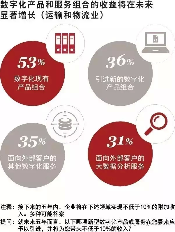 数字化带来绩效上的巨大突破 我们的受访者预计,在实行工业4.0相关计划后,未来五年的收益将大为增长。总的来说,参与调研的企业预期每年能减少3.6%的运营开支。相对其他受访企业而言,运输和物流公司总体行情稍显低迷,尽管如此,他们还是认为能有效减少开支。 在探索数字化和数据分析的道路上,反应滞后的企业可能感到难以参与竞争。随着市场愈发注重成本竞争力,任何运输和物流企业都无法承担将改善成本和收入状况的机遇让与竞争对手的后果。 与更具创意客户深化数字化关系 绝大多数我们接触的公司都预期会通过数字化对现有产品或开发新的数字产品来强化面向客户的数字化服务。机遇不仅在于大力提高灵活性、更快应对客户需求的能力,还在于对其需求的预测,通过一系列具有预见性的方法助力客户率先了解自身需要。许多运输与物流公司计划以各种形式扩展自身数字化组合。