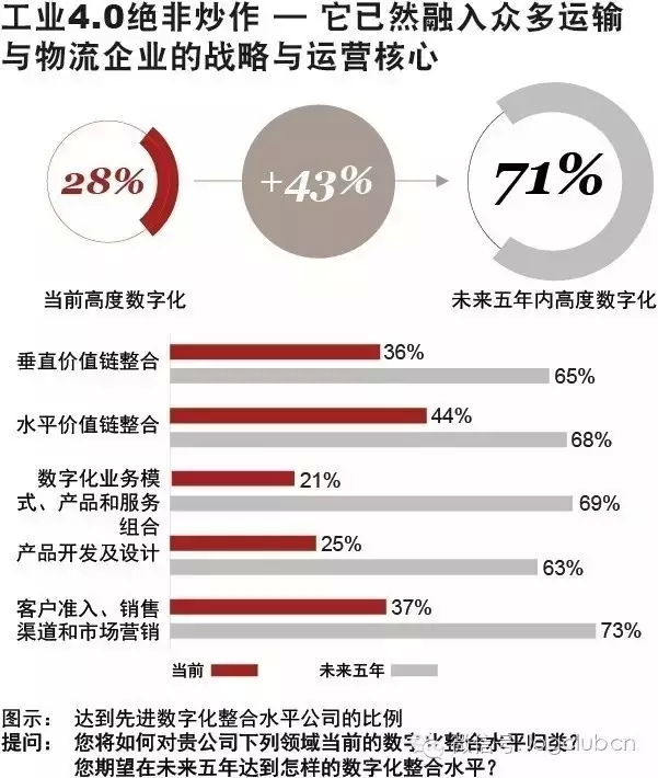 工业4.0已由构想付诸实践 先前围绕工业4.0进行的讨论已由某些人士眼里的炒作转变为投资和真实的成果。据报道,在接下来的五年,整个运输和物流行业拟将年收入的5%投入到数字化运营方案中。对于一个利润微薄的行业而言,该项投入数额重大。该种投资不断转化为越发先进的数字化整合成果。部分(1/4至1/3之间)运输和物流企业认为自身的数字化整合早已达到先进水平,而大约3/4的公司表示五年内就能达到这一水平。