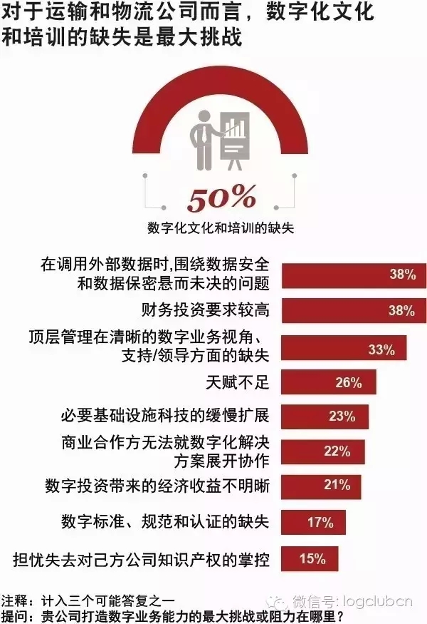 专注人才与文化,推动转型 工业4.0对于公司如何选择自我组织及配送模式颇具昭示意义。企业需要确保自身员工理解公司变革,并且清楚如何参与这一进程。根据我们对运输和物流企业的采访,企业最大的挑战在于内部问题(文化、组织、领导和技能)。 受访运输与物流企业认定数字化文化及正确培训的缺失是最大挑战之一。半数企业将之列入三大挑战之一。就此而言,在调研中显示,将文化变革列为全行业首要议题的都是那些较为优秀的企业。