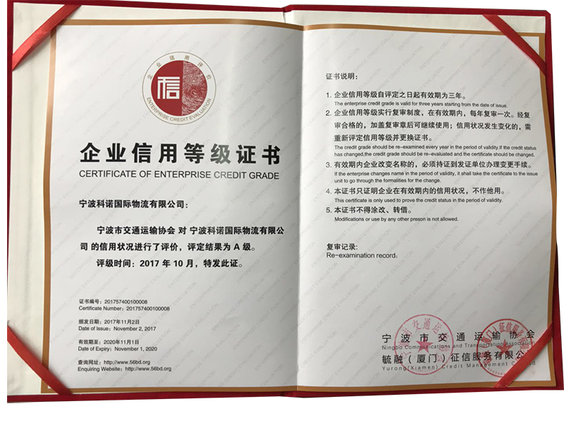 恭喜宁波科诺国际物流有限公司信用评定结果为A级!